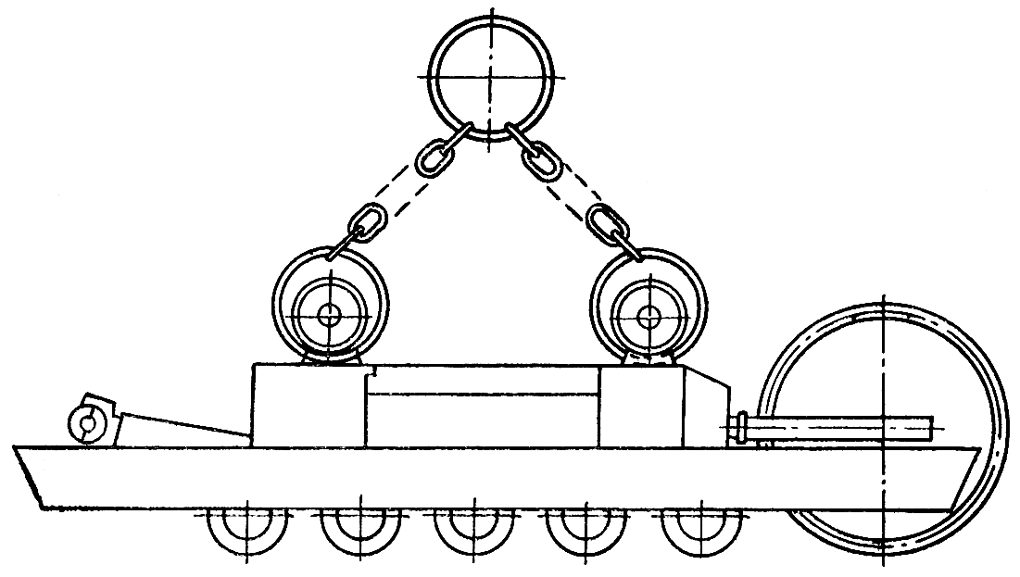 Приподнимите тележку краном с помощью приспособления (рис. 302). Выверните четыре болта крепления концевого подшипника и выньте планку из трубы рамы. Выверните четыре болта 10 (см. рис. 301) крепления крышки И пяты раскоса и снимите ее в сборе с вкладышем 12. Опустите тележку на гусеницу. Наклоните тележку гусениц в наружную сторону до выхода балансирной рессоры из кронштейна. Поднимите и переместите тележку на место ее разборки. Масса тележки 1471 кг. Поставьте крышку пяты раскоса на прежнее место.