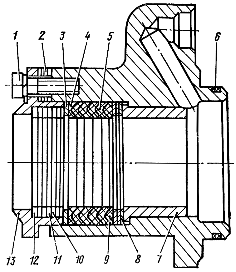 Установите в расточку скребка 13 двенадцать чистиков 12 толщиной 1 мм, десять чистиков 11 толщиной 0,6 мм и восемь чистиков 10 толщиной 0,2 мм. Чистики 11 толщиной 0,2 мм и 10 толщиной 0,6 мм установите через один, начиная и кончая чистиком 11 толщиной 0,6 мм. Вставьте в отверстие крышки скребок с чистиками и установите между скребком и крышкой двенадцать прокладок 2. Совместите отверстия в скребке, прокладках и крышке, вставьте в них болты 1 с пружинными шайбами и заверните их на 2...3 оборота. Наденьте в канавку крышки резиновое кольцо 6 и смажьте его моторным маслом.