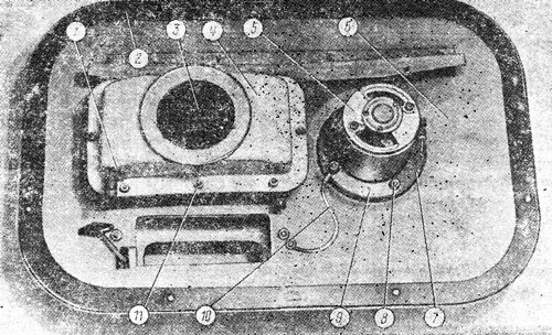 Соберите верхнюю половину кожуха 13 ( см. рис. 308 ) теплообменника с плитой 9, фланцем 11 и двумя планками 12 и совместите отверстия в них. Наденьте на четыре болта 6 шайбы, вставьте болты в совмещенные отверстия и соедините детали, закрепив четырьмя гайками с пружинными шайбами. Установите корпус 5 в сборе с тягой, заслонкой на плиту 9 и закрепите его двумя болтами 4 с гайками и пружинными шайбами. Установите на кожух отопителя 5 ( см. рис. 311 ) уплотнение 3 и прокладку 4. В кожух отопителя 5 установите 18-57-103СП вентилятор-пылеотделитель 1, на электродвигатель -вентилятора наденьте две прокладки 7 и четыре втулки 6. Наденьте резиновый патрубок 2 на кожух вентилятора. Установите на кожухе отопителя 8 ( см. рис. 308 ) плиту 9 с собранным корпусом 5 и верхней половиной кожуха 13 теплообменника. Соедините резиновый патрубок 7 вентилятора с фланцем 11 на плите. Наденьте на электродвигатель 5 ( см. рис. 310 ) вентилятора две прокладки 7, на болт электродвигателя провод массы 10 и закрепите вентилятор-пылеотделитель на плите 6 восемью гайками с контргайками 8, двумя планками 9. Наденьте на болты кожуха отопителя прокладку 2. На отводящие и подводящие трубки радиатора 3 наденьте прокладки 1 и установите радиатор в верхнюю половину кожуха теплообменника, Прикрепите крышку 4 кожуха теплообменника восемью болтами 11 с гайками, плоскими и пружинными шайбами.