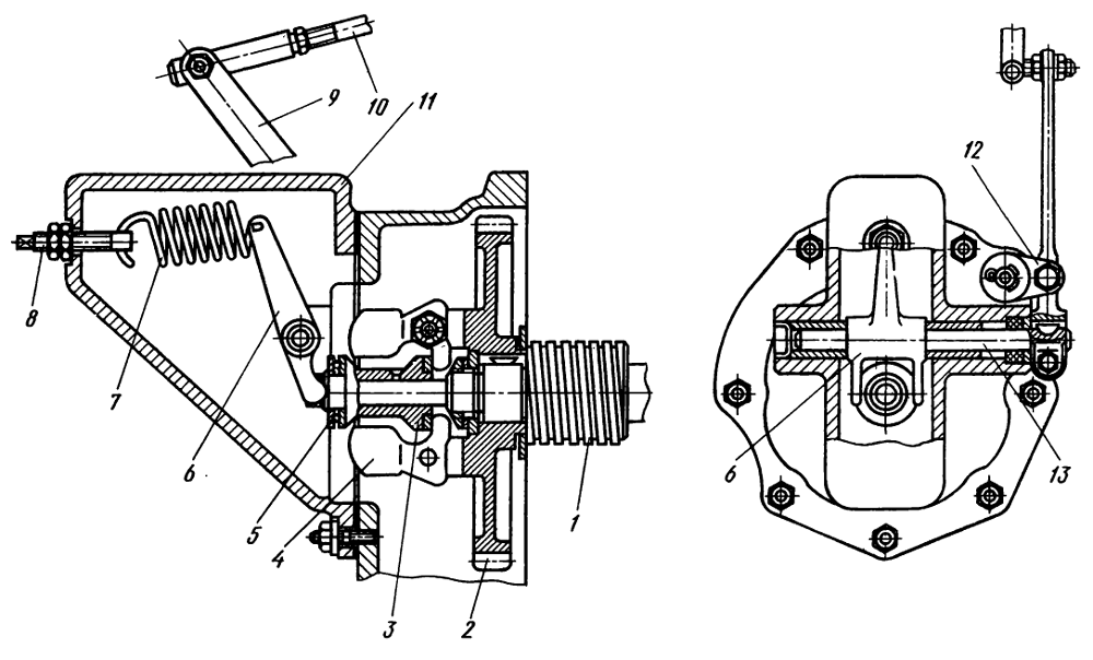 При правильно отрегулированной длине тяги максимальную частоту вращения коленчатого вала двигателя регулируют, изменяя натяжение пружины 7 регулятора путем свинчивания или навинчивания гайки на регулировочный винт 8 пружины. При навинчивании гайки натяжение пружины увеличивается с одновременным возрастанием частоты вращения двигателя.